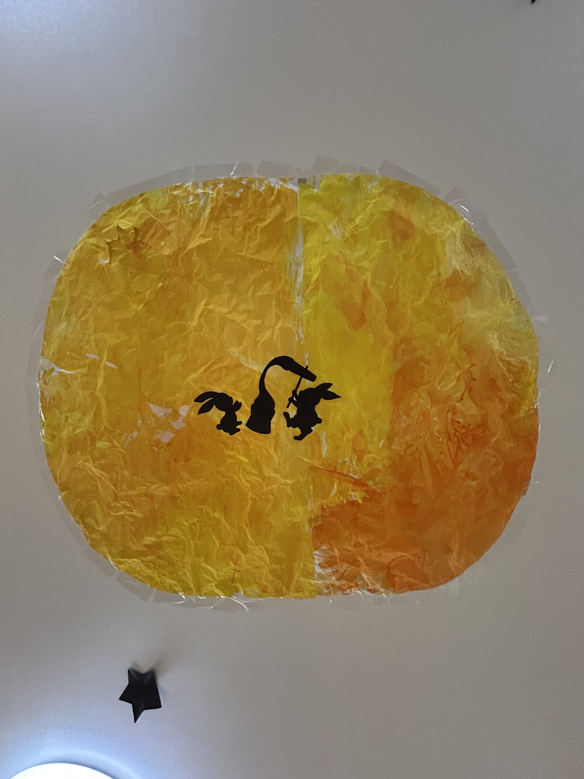 (子どもたちが塗った模造紙を保育者が丸く切ってうさぎをつけて、天井に貼りました🌕)