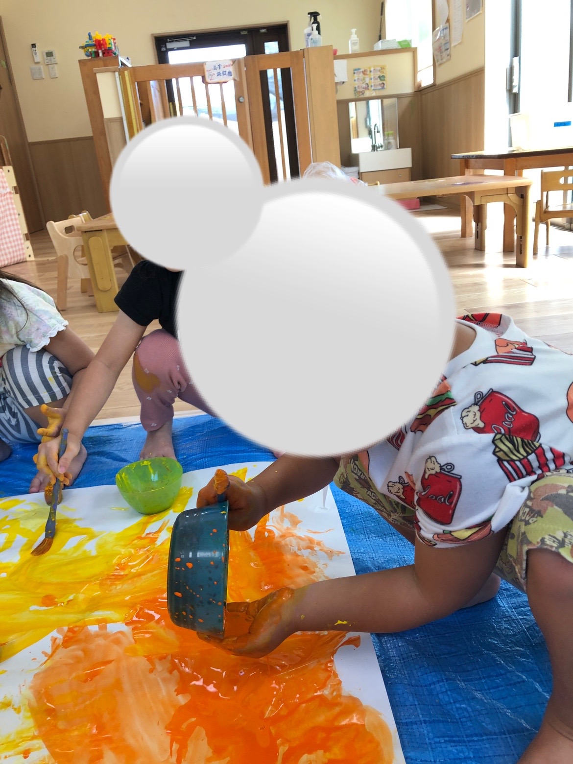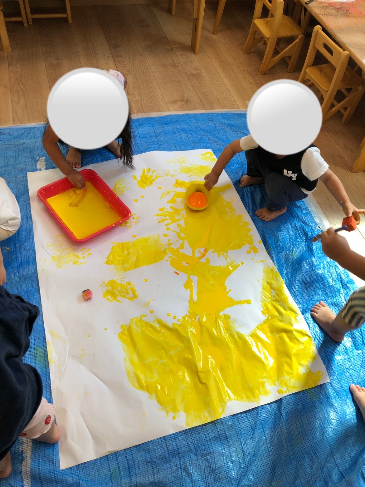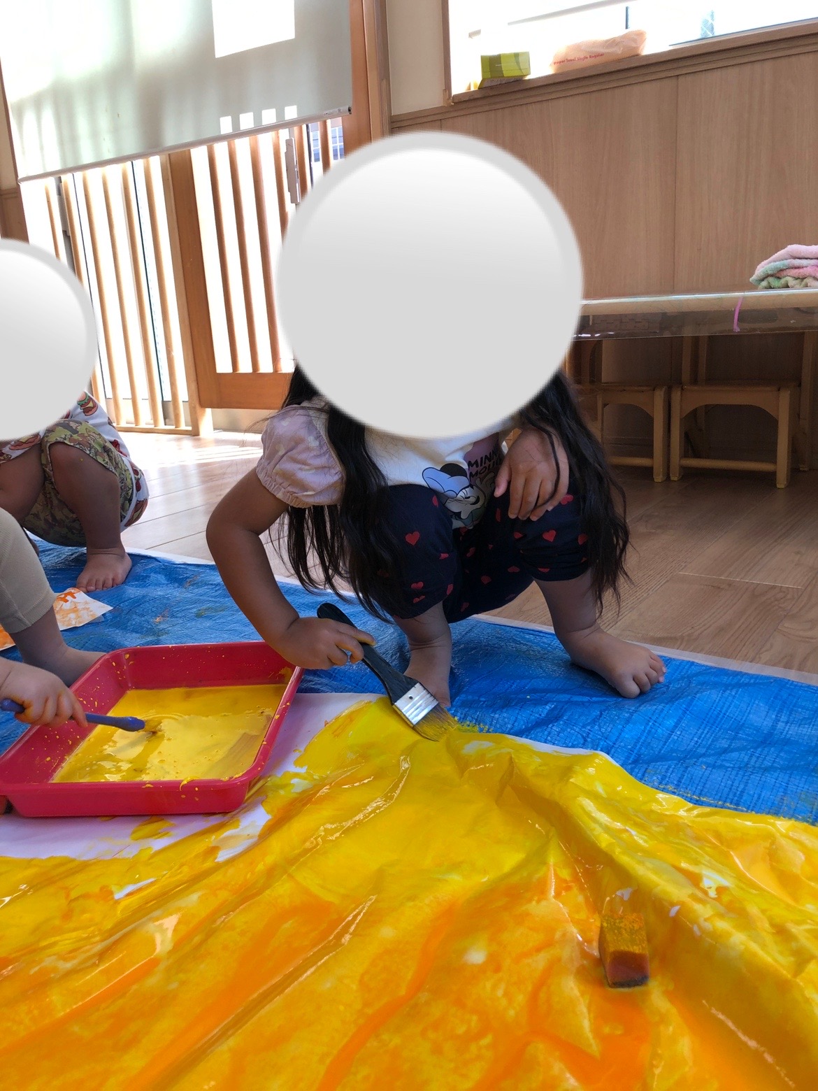 この前、Blueさん(2歳児)がクラフト(製作)で模造紙に絵の具を使用して色を塗りました!