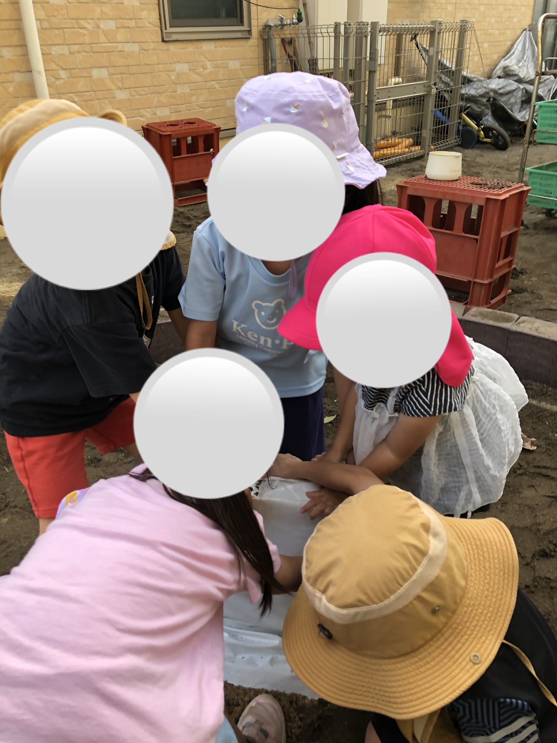 子どもたちが、それだと効率が悪いと気づき、途中から子どもたちが自分たちで考えて、スコップを使って砂を出す方法に変えてました!!