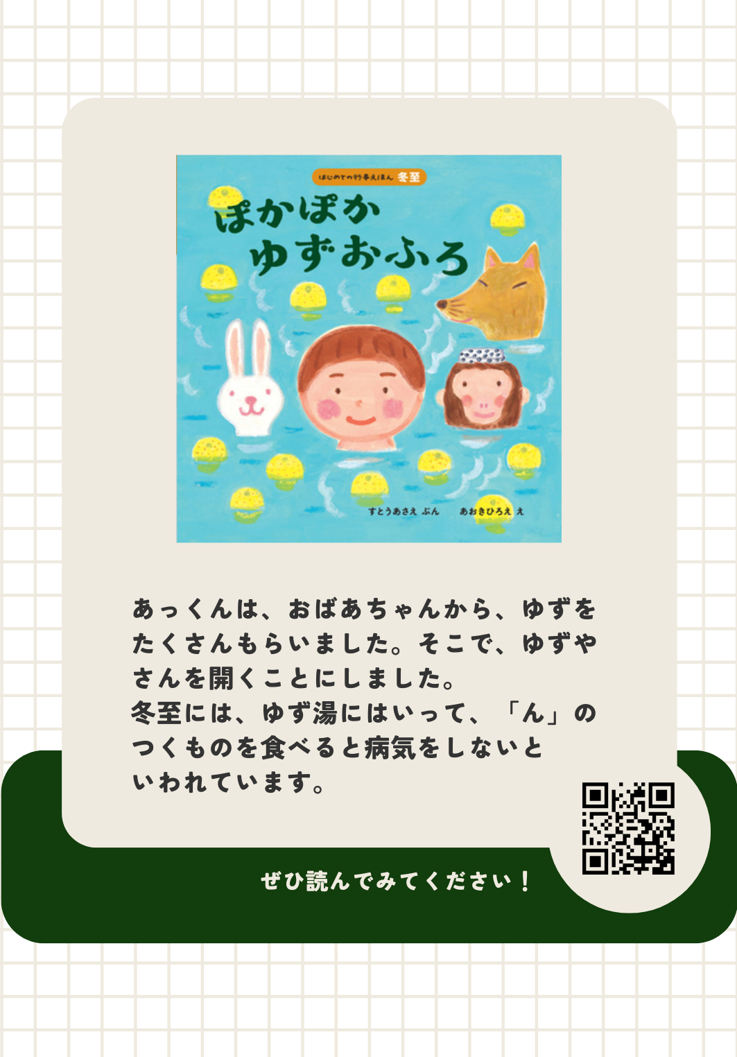 今週の絵本は[ぽかぽかゆずおふろ]です。