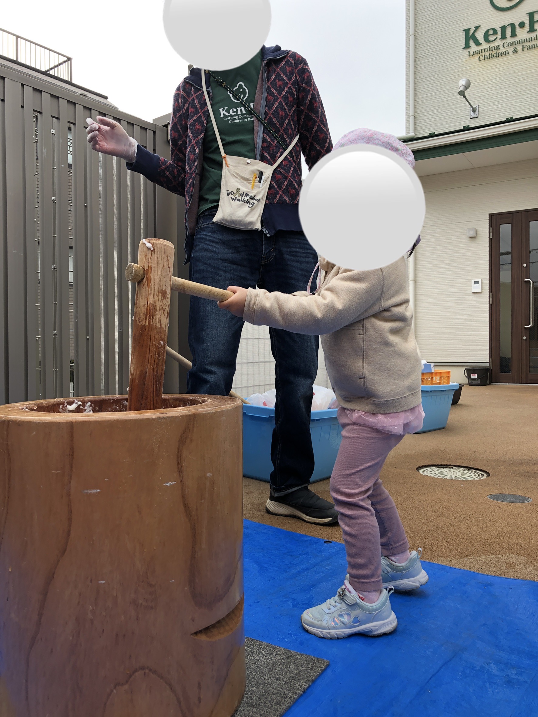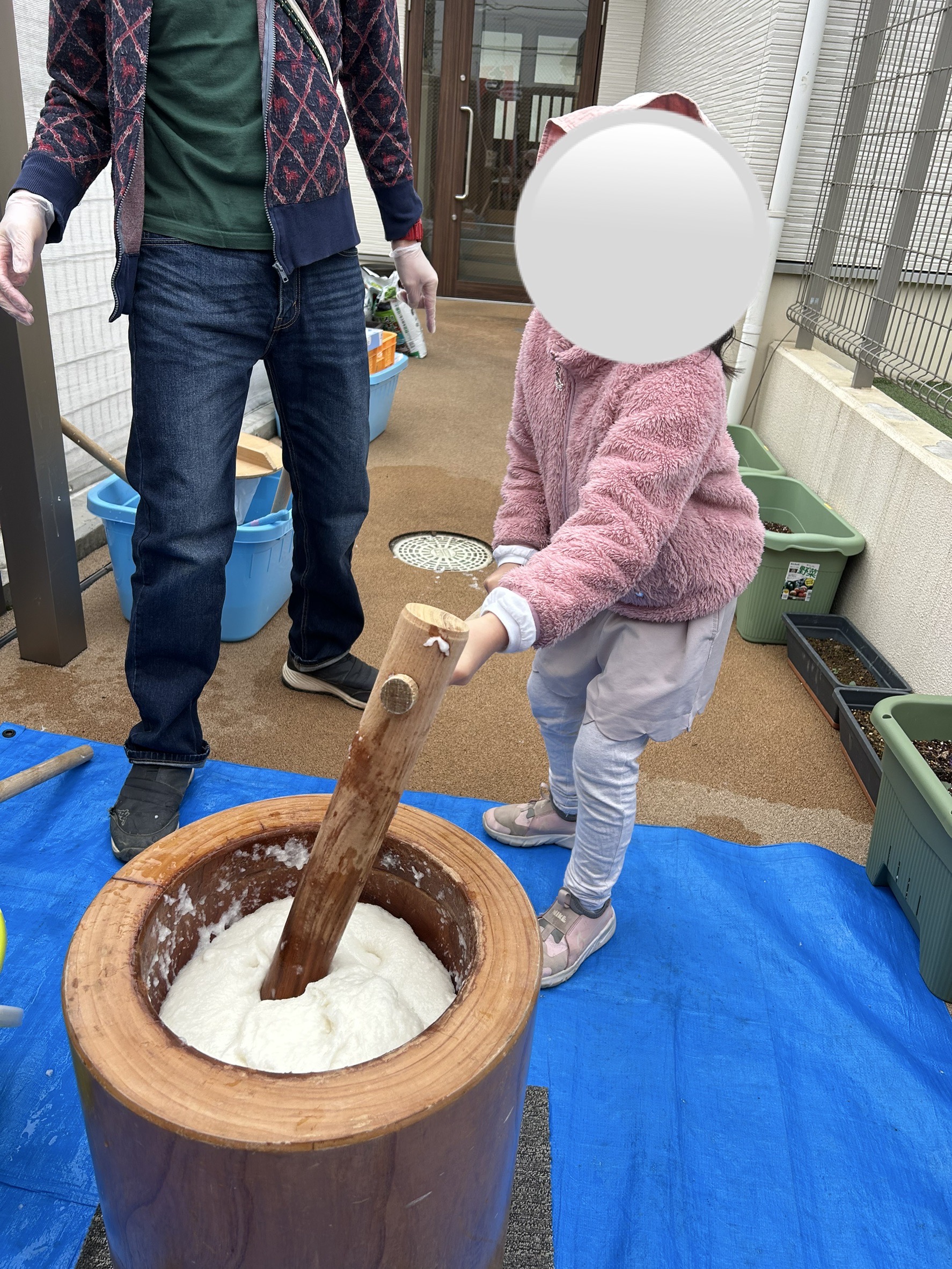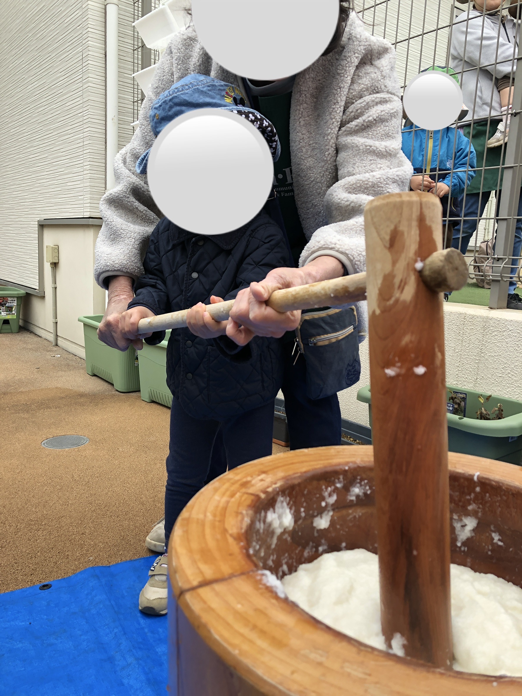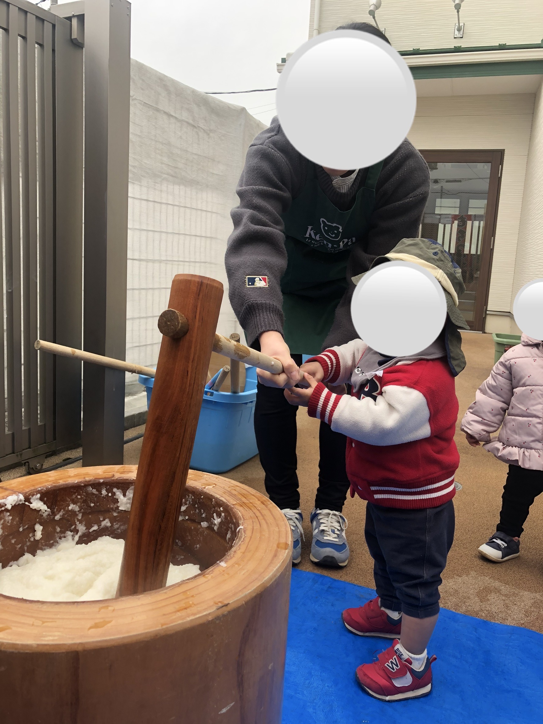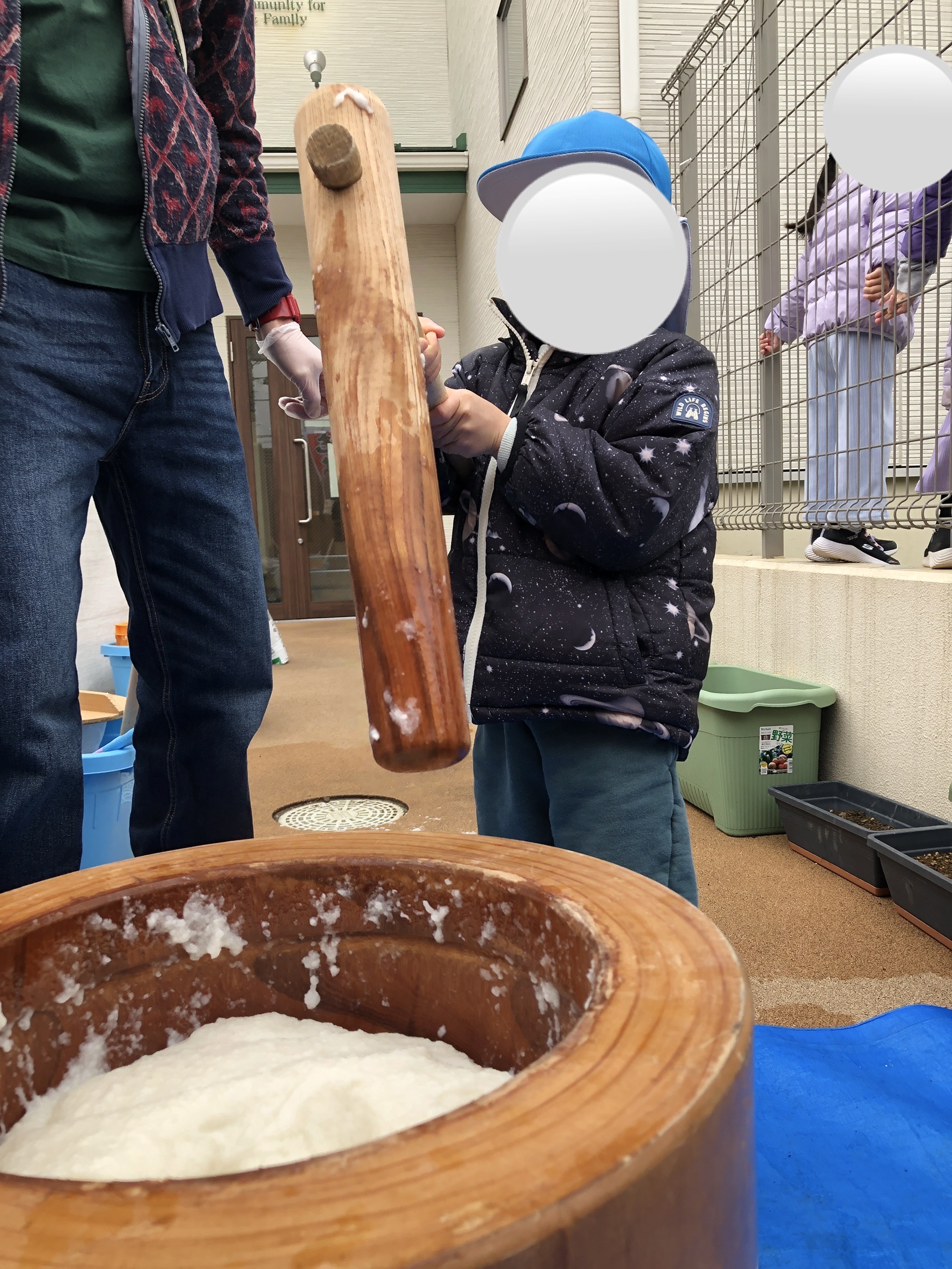 Blue Bearsさん(2歳児)は、保育者と一緒に杵を持ったり、1人で挑戦する子どももいました!