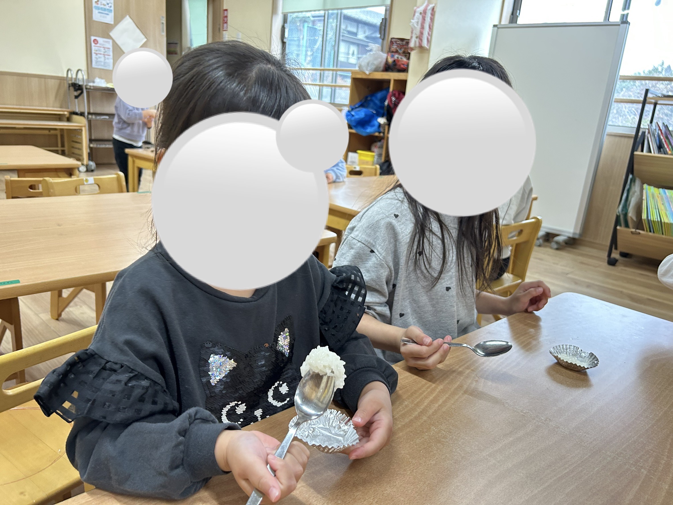 New Year’s Partyでは、お正月の話を聞いたり、2歳クラス以上の子どもたちがもち米を試食しました🍚