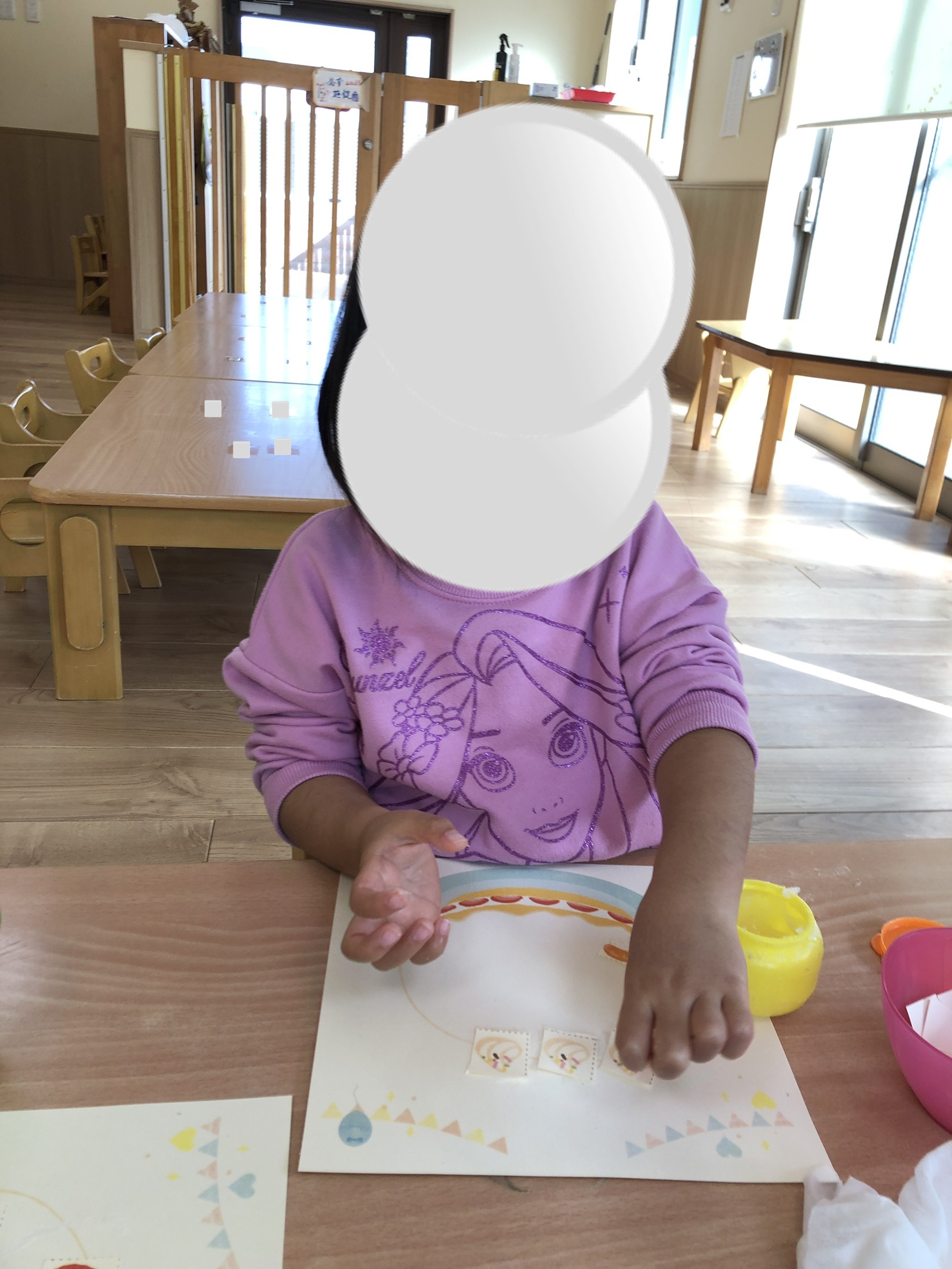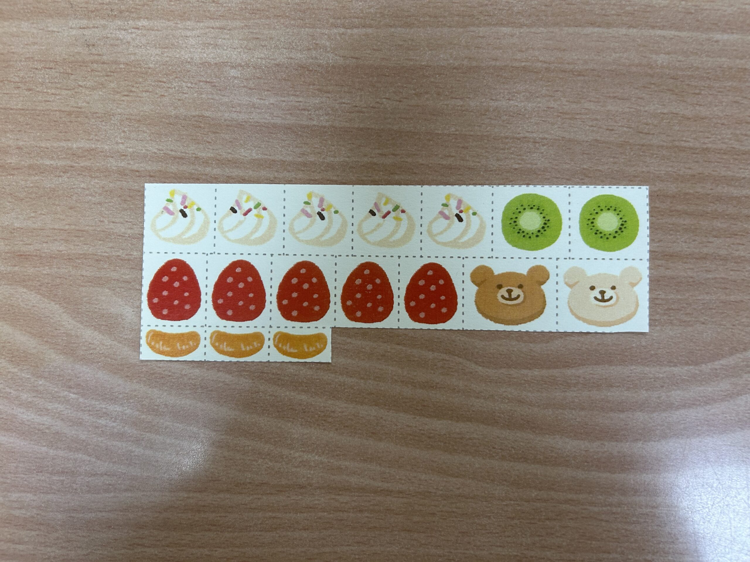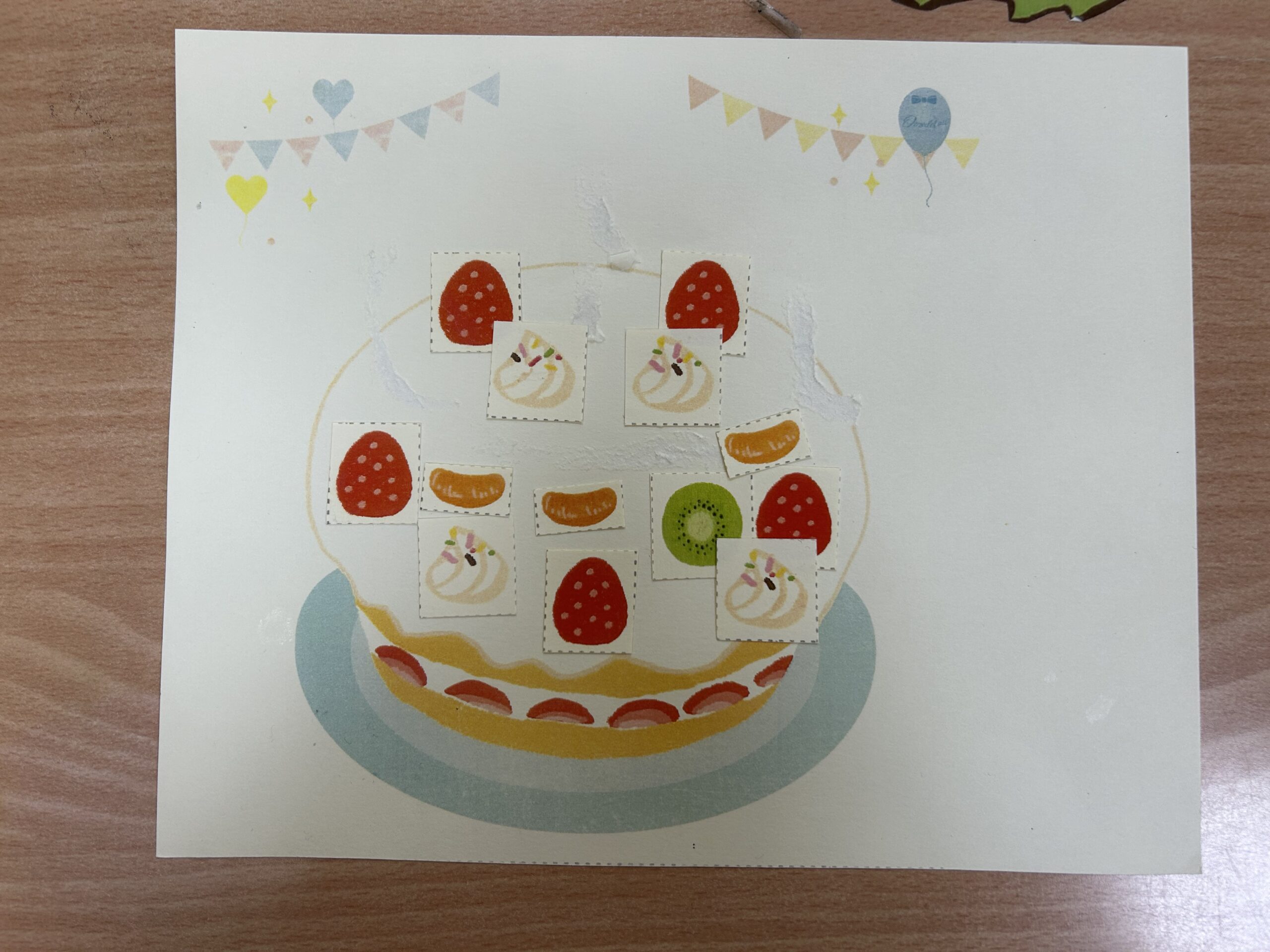 切り終わったら、ケーキが描いてある紙に今切ったフルーツ・クリームの紙をのりで貼ってオリジナルのケーキを作りました🍰