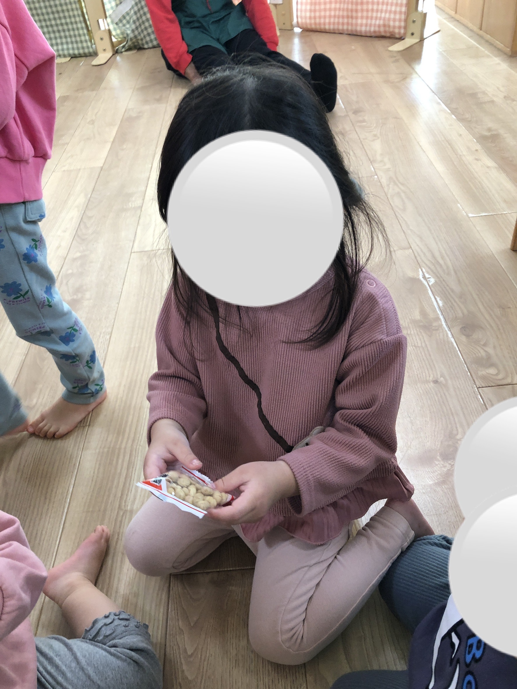 乳児さんでは、初めに節分の紙芝居を見たり、実際に袋に入った大豆を触りました。