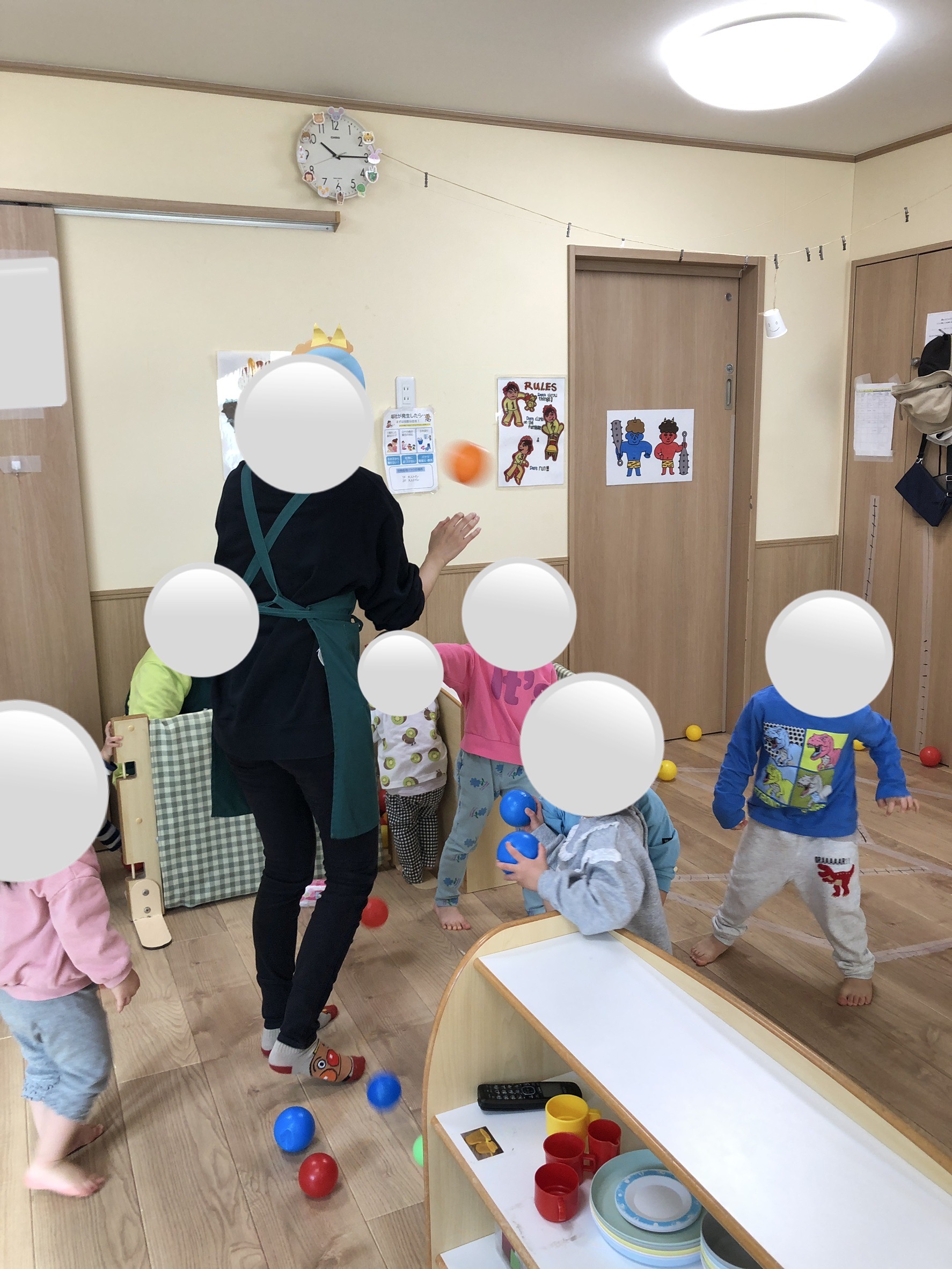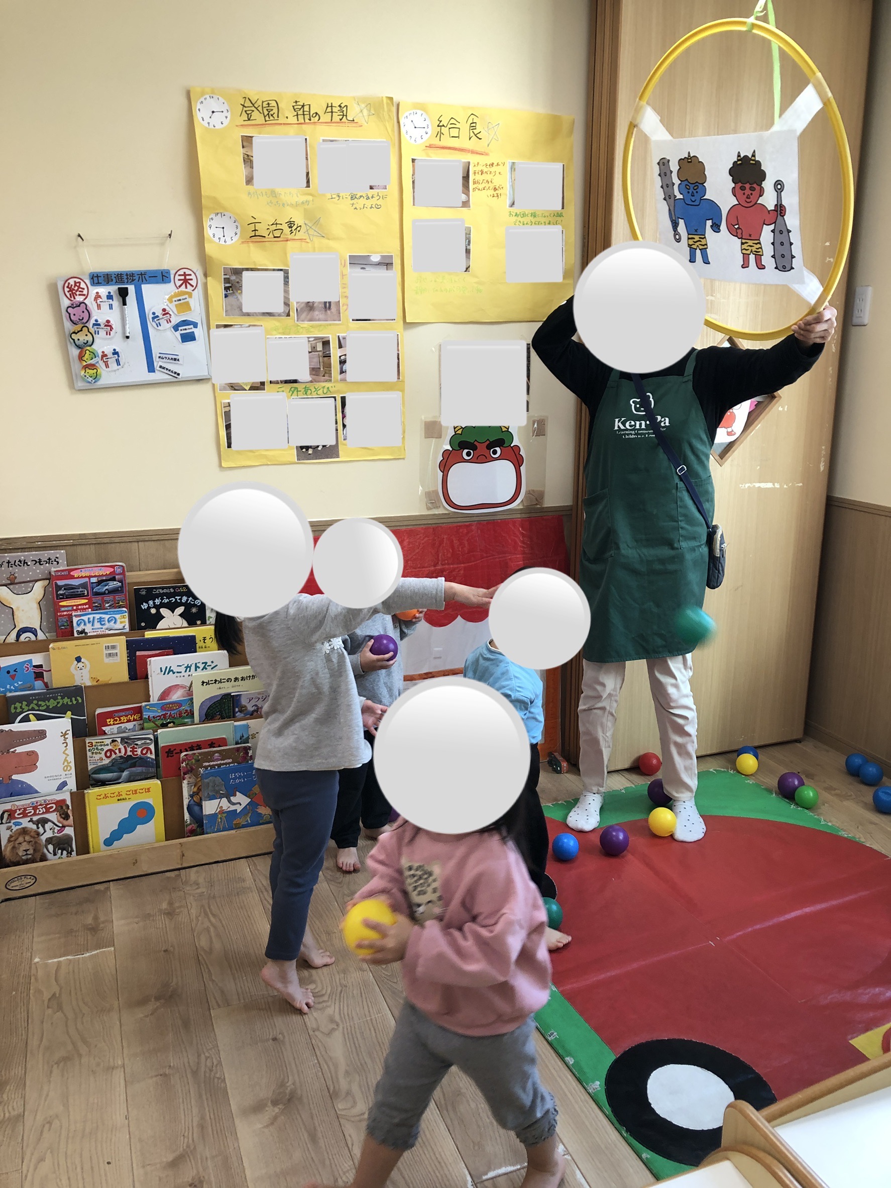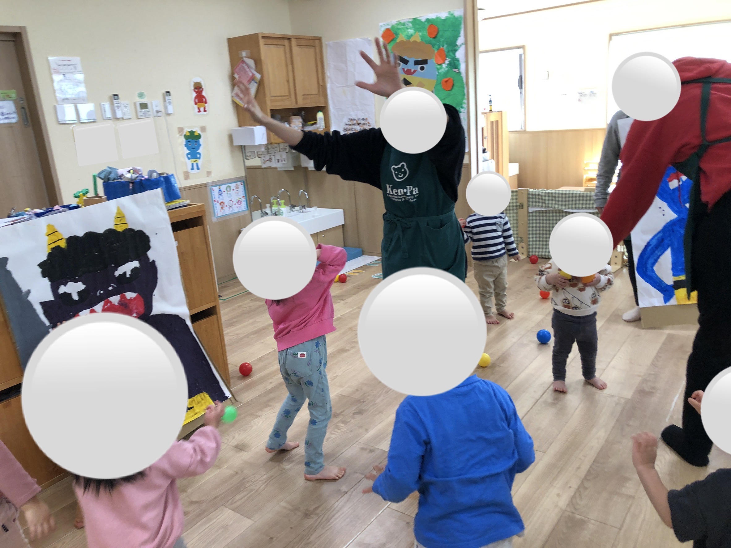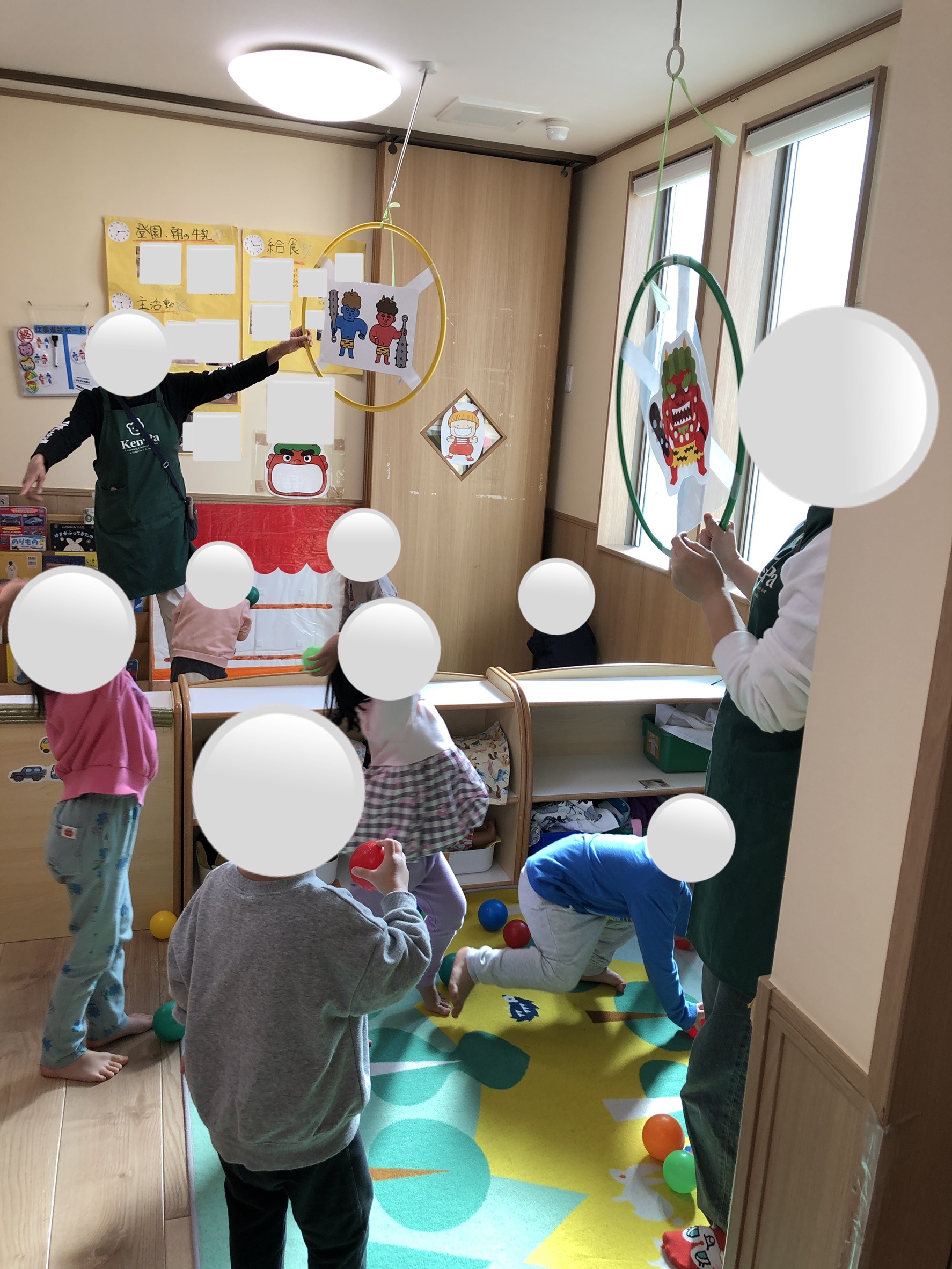 その後は、壁や天井に吊るしてある鬼のイラストにカラーボールを使って豆まきをしました。