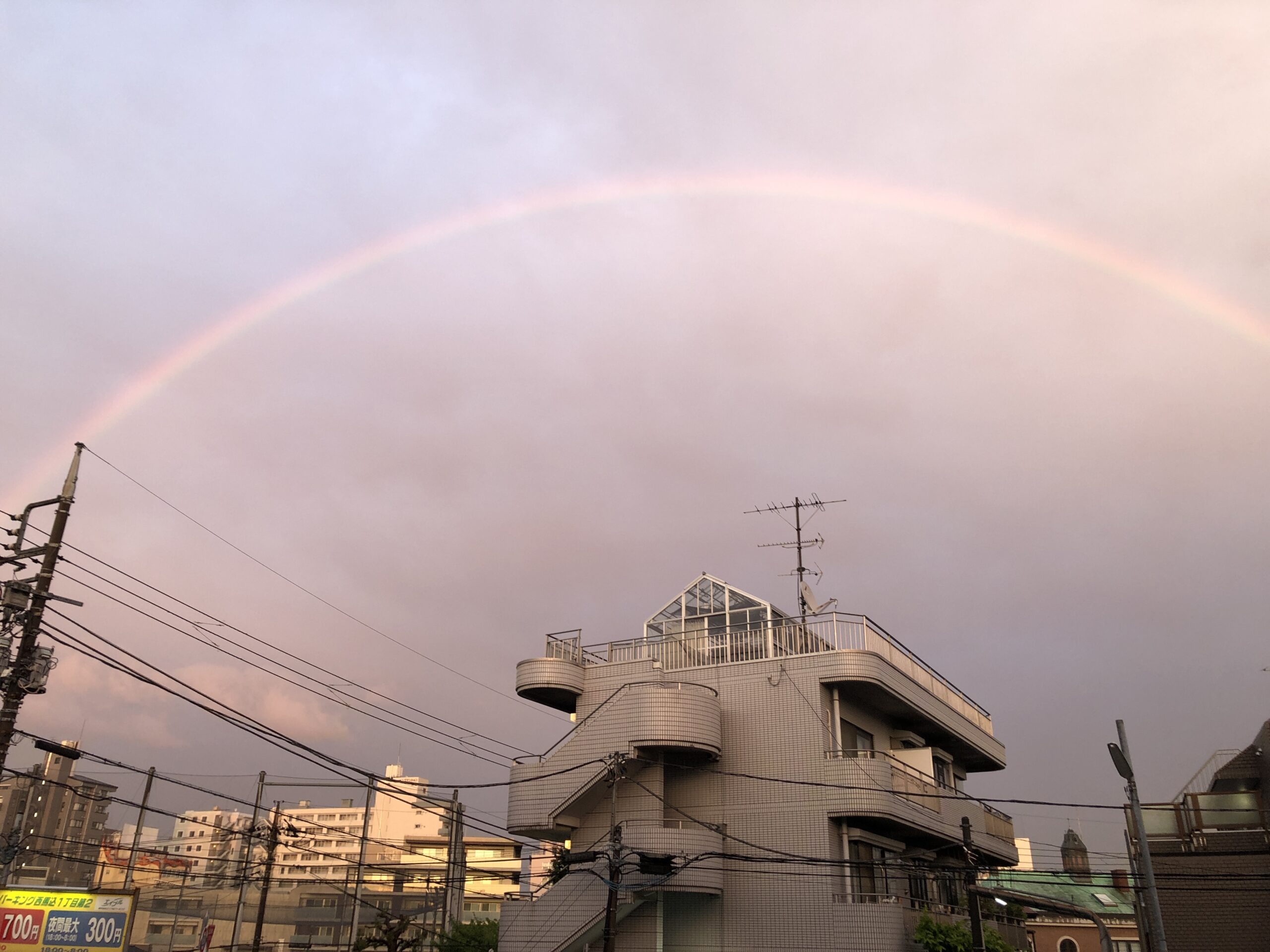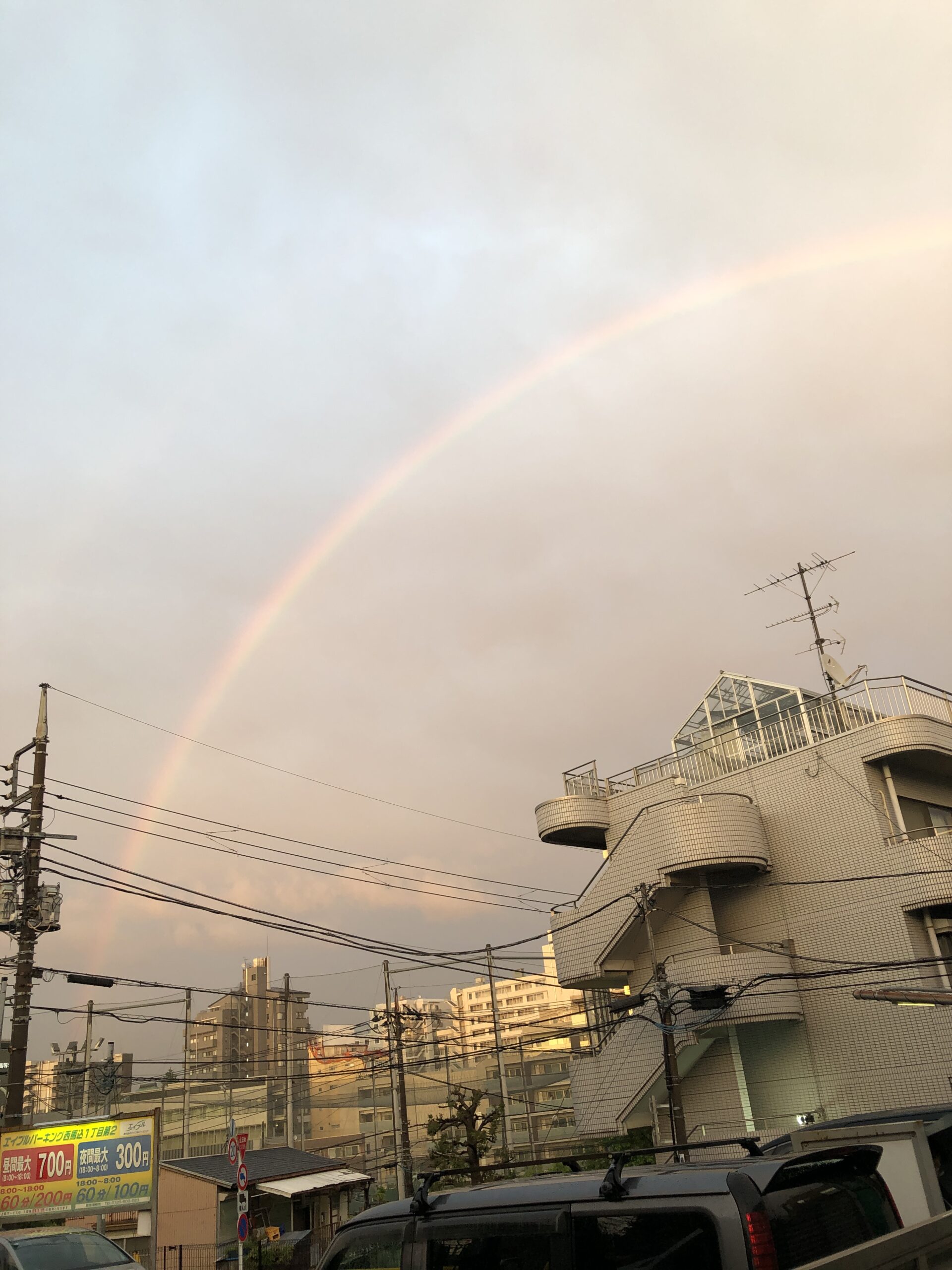 昨日の夕方のお迎えの時間になり、外が少しずつ暗くなってきてもまだ雨は降っていましたが、外を見ると大きな虹が出ていました!